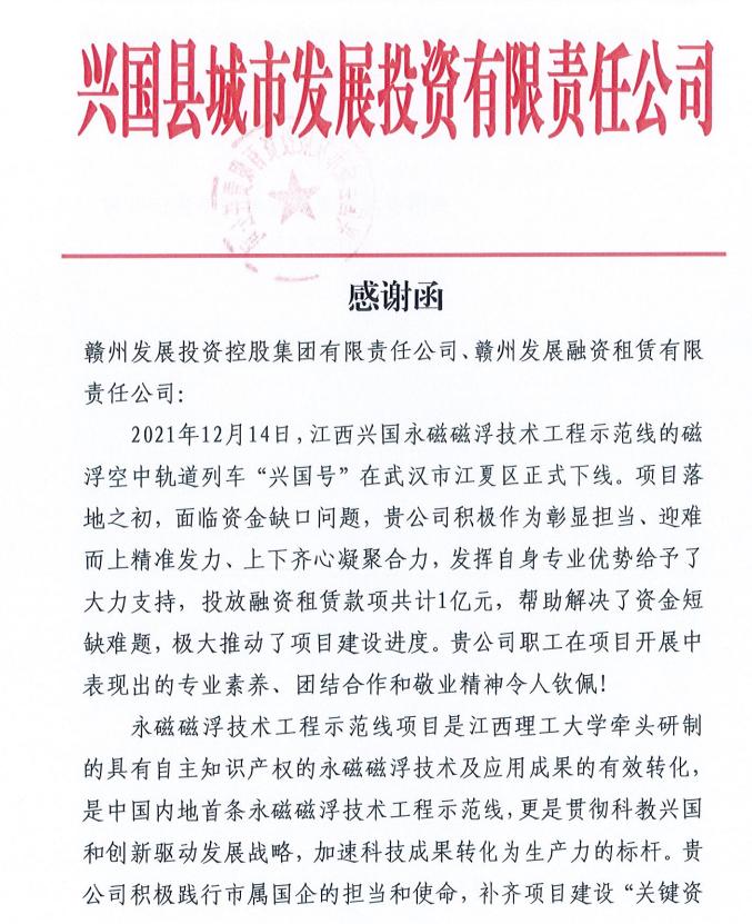 近日,贛州發展集團旗下融資租賃公司提供1億元融資租賃資金支持興國縣建成的國內首條永磁磁懸浮空軌建成調試,空軌上的”興國號”磁浮列車已實現調試通車,預計7月份正式進行通車運營。