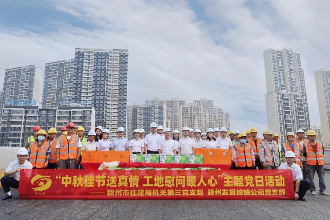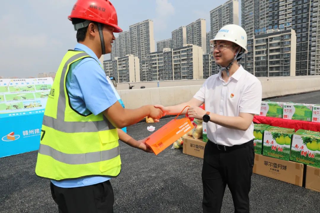 中秋節前夕,9月28日,贛州發展集團黨委副書記、總經理梁敏輝帶隊深入東江源快速化改造工程、贛南大道快速路(貢江大橋-贛縣北收費站)項目現場,走訪慰問項目一線施工人員,并開展安全生產檢查。集團黨委委員、風控總監劉昭祥陪同走訪。市住建局機關第三支部以聯建共建主題黨日活動的形式共同參與此次慰問活動。