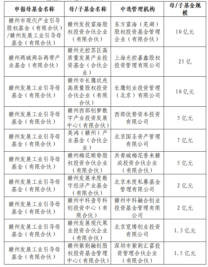 根據《贛州“兩城兩谷兩帶”產業基金管理辦法》、《贛州“兩城兩谷兩帶”產業基金合作機構遴選指南》、《贛州市現代產業引導股權基金子基金管理人申報指南》等相關規定,將截至2024年12月31日,贛州“兩城兩谷兩帶”產業基金及贛州市現代產業引導股權基金已完成設立的子基金及子基金管理機構公示如下: